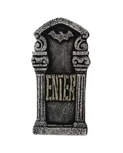 Der graue Gothic Grabstein ist mit der Abkürzung der Inschrift „Rest in peace“ und zwei Knochengerippen an den Seiten verziert, während mittig ein skelettierter Engel prangt. Dazu passen der Hanging Reaper und unser abgetrennter Zombie Arm.