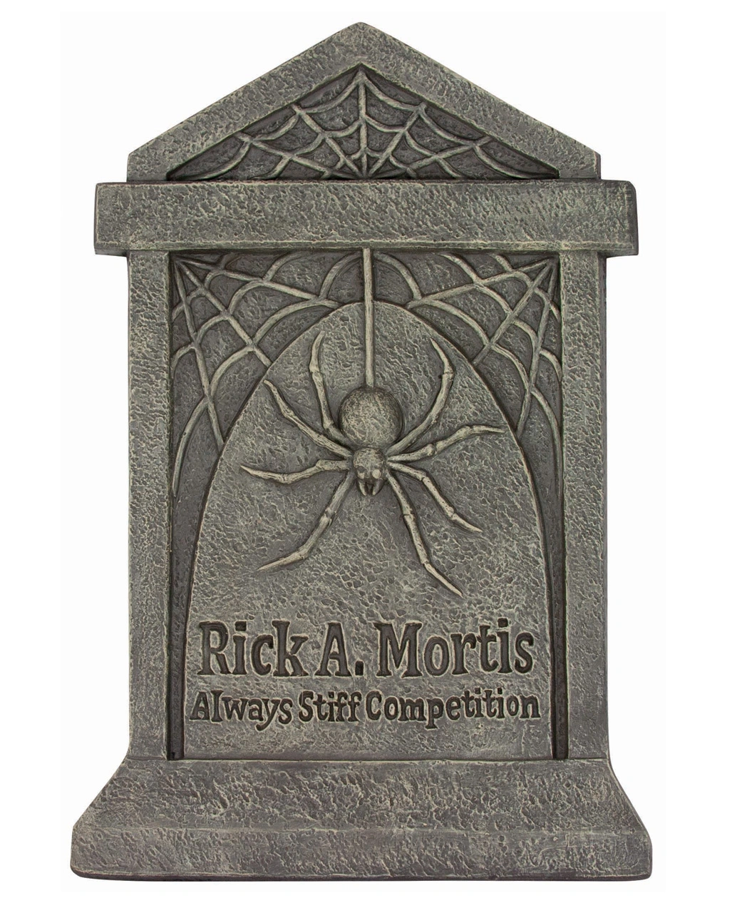 Der Grabstein mit Spinnennetz & Spinne enthält neben dem fiesen Krabbeltier auch eine Inschrift: „Rick A. Mortis – Always Stiff Competition“. Die beigefarbenen Highlights verleihen dem künstlichen Grabstein den Anschein von Textur und Verwitterung. Mit ein wenig Grünes Deko Moos 80g und Halloween Spinnennetz weiß 40gr. dekoriert fügt sich der Halloween Grabstein wunderbar in die restliche Friedhofsdeko ein.