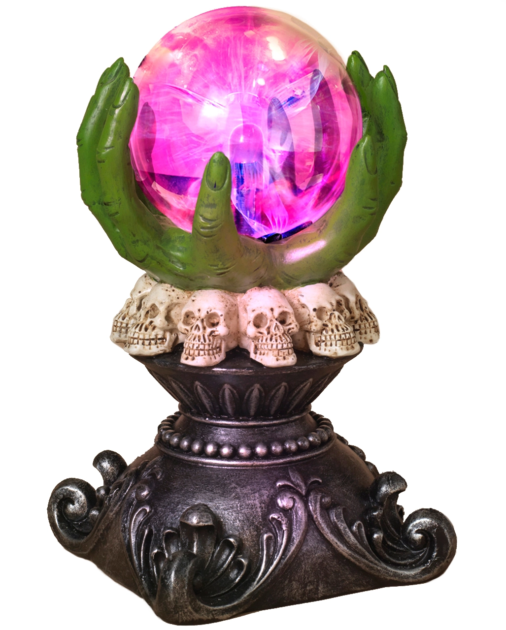 Unsere Hexenhände mit leuchtender Wahrsagekugel ist ein geniales Deko Accessoire, mit dem du ein paar sehr besondere Akzente setzen kannst. Was für ein Anblick: Die leuchtende Kugel wird von ein paar schaurigen Hexenhänden festgehalten. Der Sockel ist besetzt von Totenköpfen, die dem Ganzen eine morbide Note verleihen. Stelle die eindrucksvolle Glaskugel dorthin, wo du eine mystisch-magische Stimmung verbreiten willst.